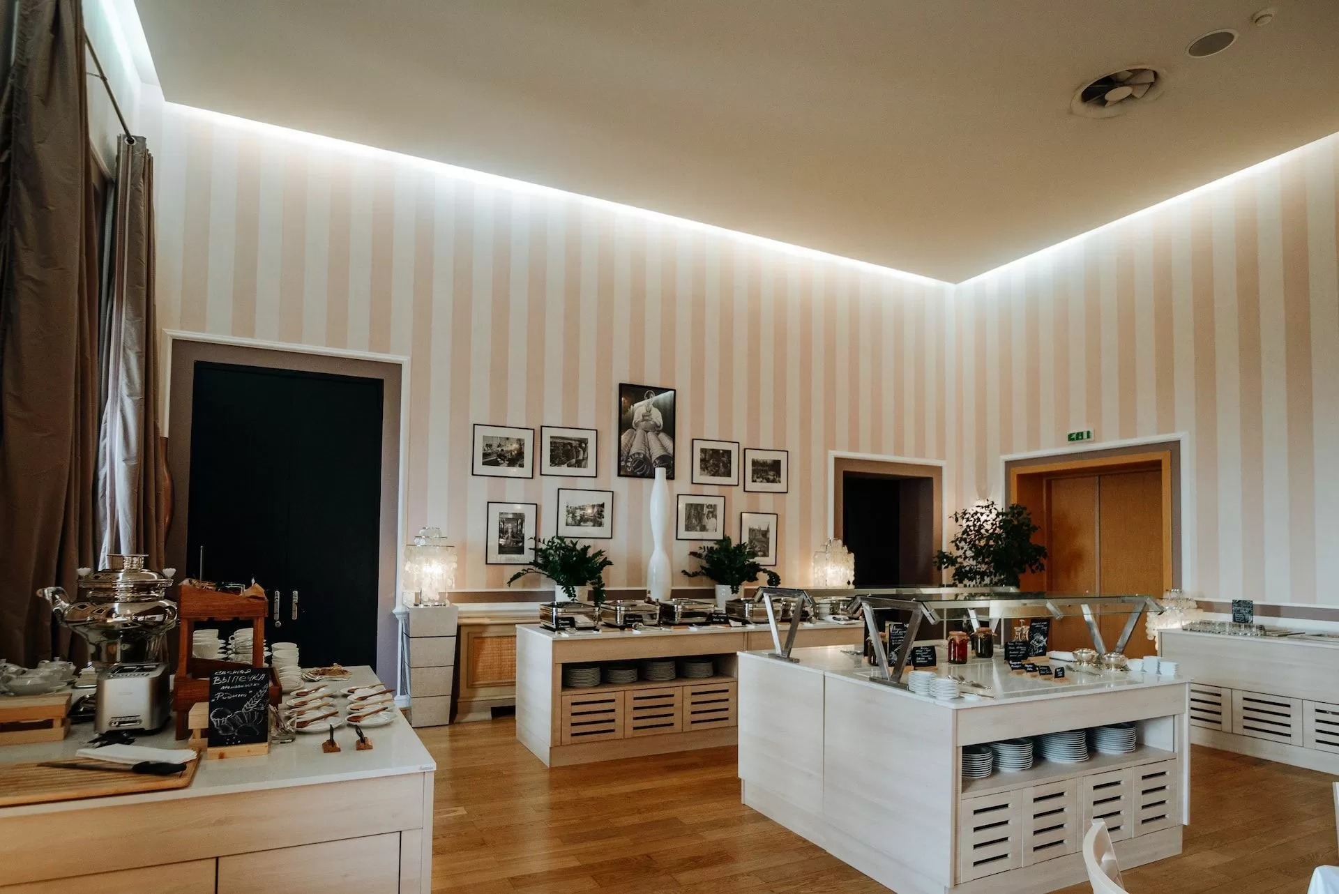 Элегантный зал выдержан в светлых тонах. Фотографии старинных московских улиц. Бра из перламутровых пластин тонко звенят от каждого движения воздуха. Все это создает атмосферу старой доброй столицы.