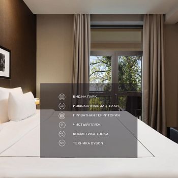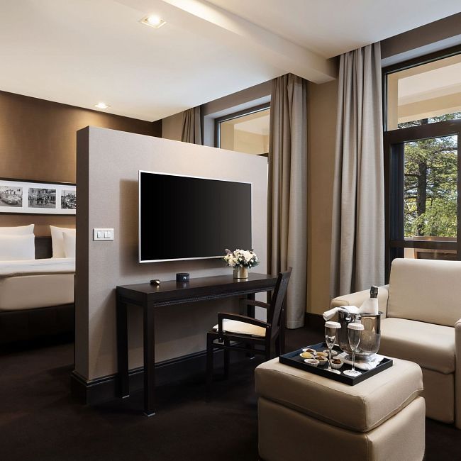 Этот просторный и комфортабельный номер выполнен в классическом стиле. Интерьер в сдержанной гамме элегантно обращает ваше внимание к живописному виду на парк. Дизайнерская платформа разделяет пространство на спальную и гостиную. Большая панорамная терраса приглашает насладиться солнечными ваннами или созерцанием звездного неба.